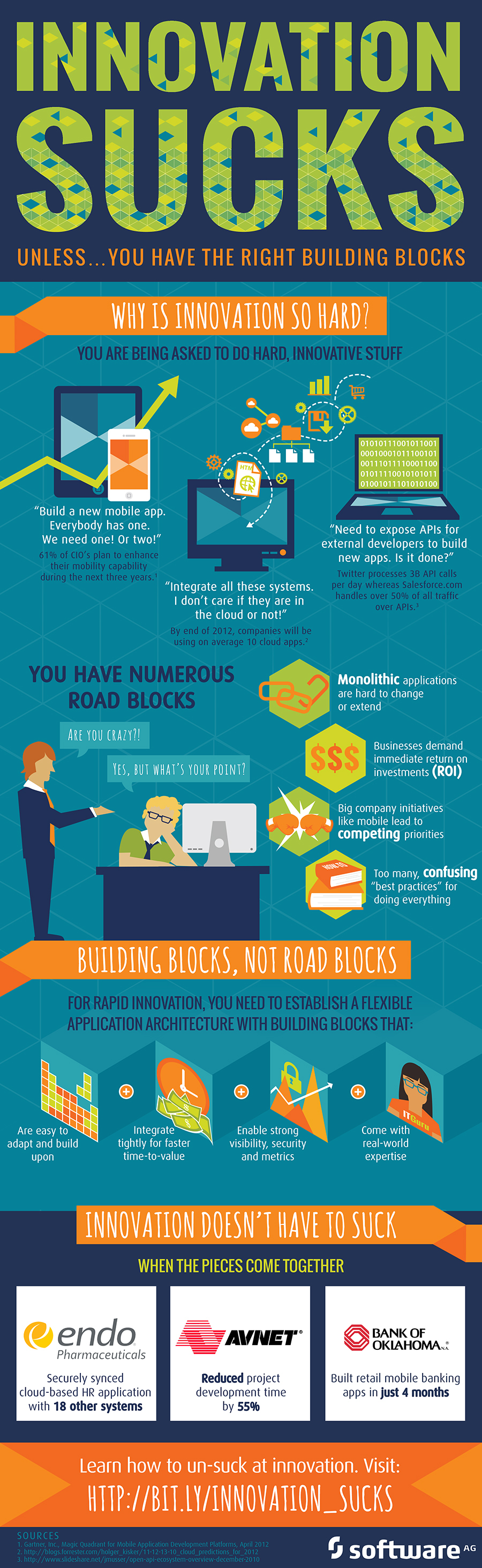InfographicOur friends at Software AG worked with us and figured out that for IT leaders, innovation sucks. That is, of course, unless you have the right building blocks with their Service Oriented Architecture (SOA). This innovation infographic walks through the demands and struggles of today's IT leaders and help them see how Software AG can help and make innovation "un-suck."
