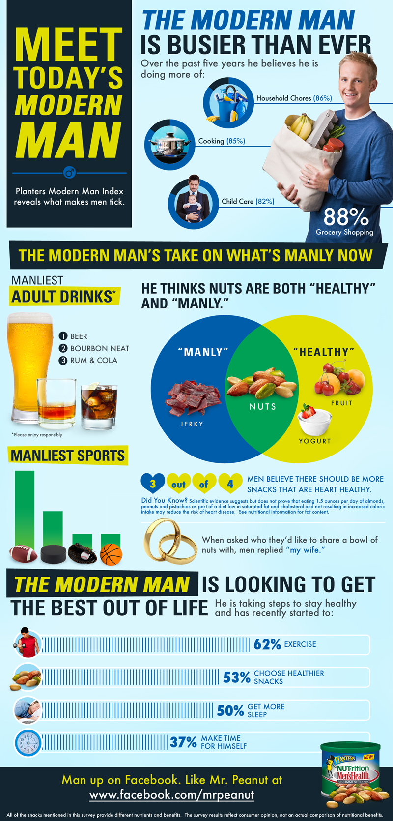 InfographicThe modern man is now busier than ever, and he still wants make sure he's maintaining the utmost "manly" appearance. What's the best way to appear manly and also stay healthy? By eating Planter's peanuts, of course.