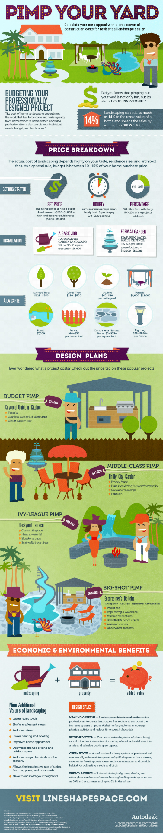 InfographicEver wondered how much different landscape projects will cost you? Just how far will $20,000 go? We've teamed up with our friends at Autodesk for this handy landscape architecture infographic. From different design plans and layouts and environmental benefits to á la carte costs, this is like the complete guide to landscaping. Let's pimp your yard!