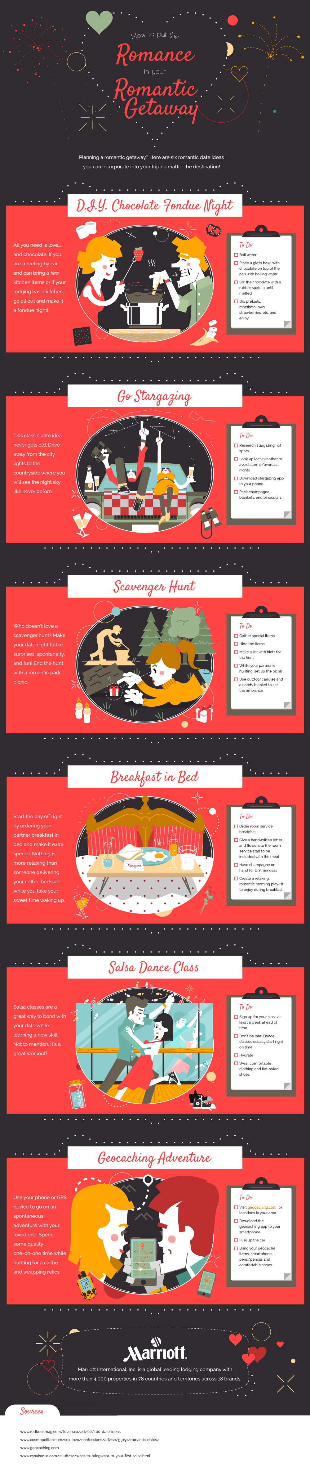 InfographicWhether you love cooking or enjoying being outdoors, there’s a perfect date night out there for you. In our latest infographic with Marriott International, we looked at a few creative date night ideas featured with a packing list for what is needed to execute each date with ease. Enjoy!