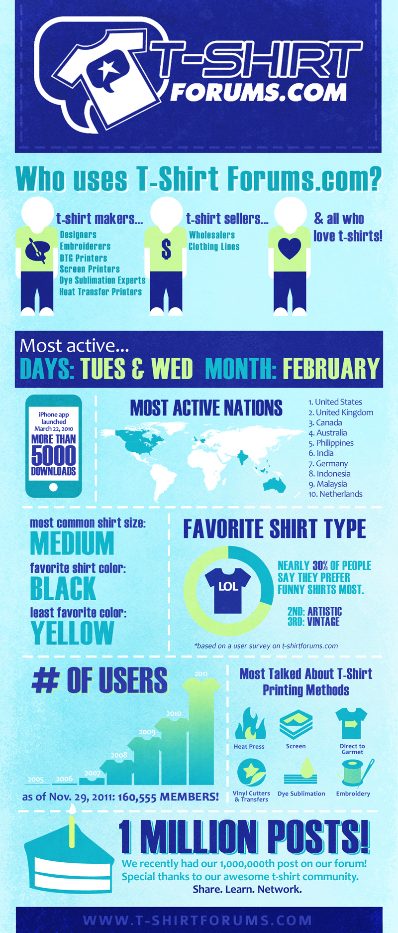 InfographicT-ShirtForums.com is a message board for t-shirt enthusiasts and anyone involved in the t-shirt industry. They recently celebrated their one-millionth post, and we created an infographic to help them celebrate.