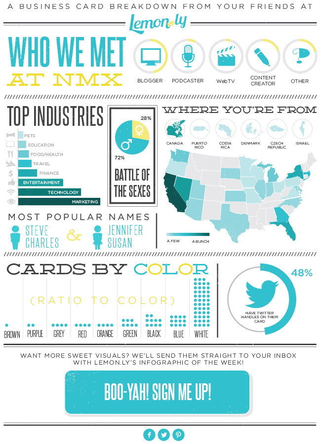 InfographicTeam Lemonly met a lot of great people while we were at New Media Expo this month. We gathered a lot of business cards from everyone we met and saw a goldmine of data on them. What better way to analyze this data than with an infographic. From state, to industry, to business card color, we've got it. Check out who we met at NMX.