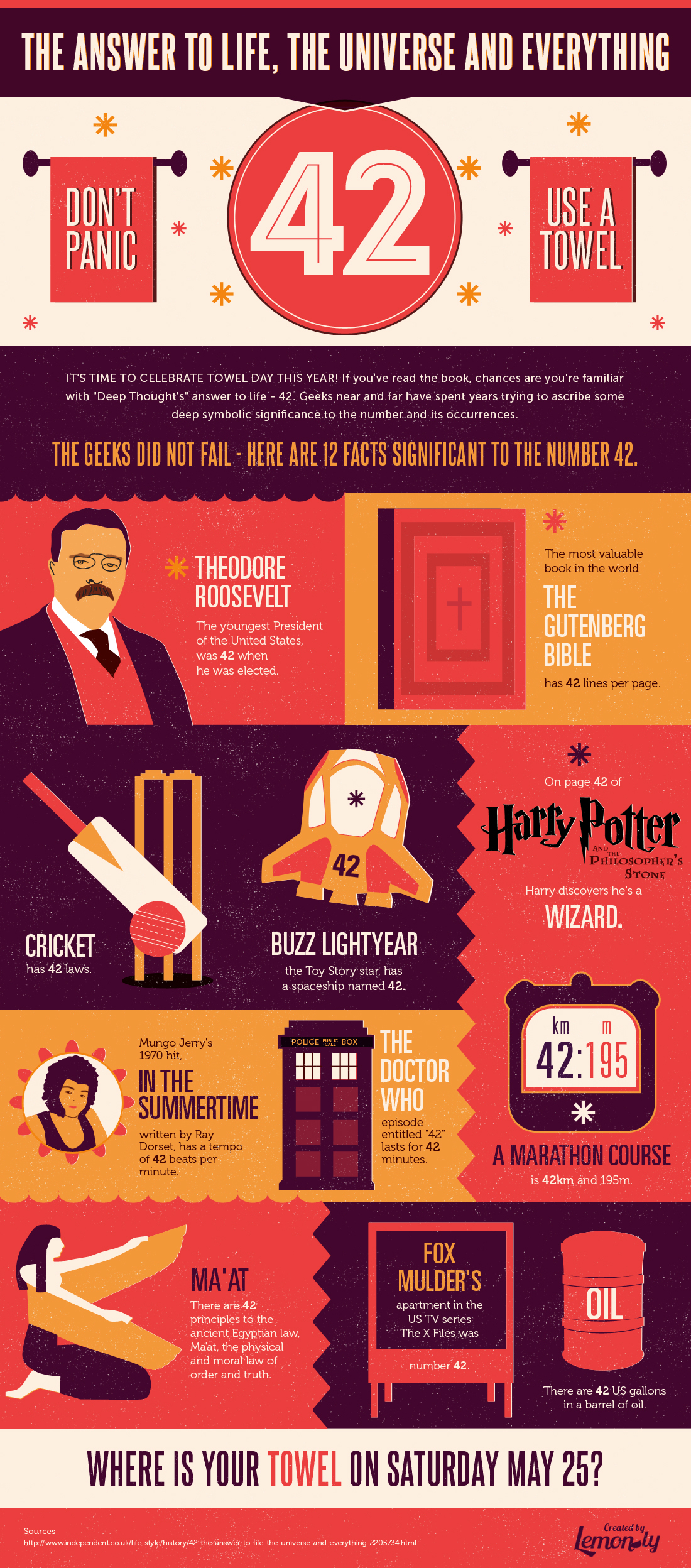InfographicIf you're a Douglas Adams fan, you know that 42 is the answer to life, the universe, and everything. Our resident Adams fan, Ana, decided to design an infographic about 12 significant facts surrounding the number 42 for Towel Day. Not sure what Towel Day is? Check out our infographic from last year. Don't panic. Use a towel.