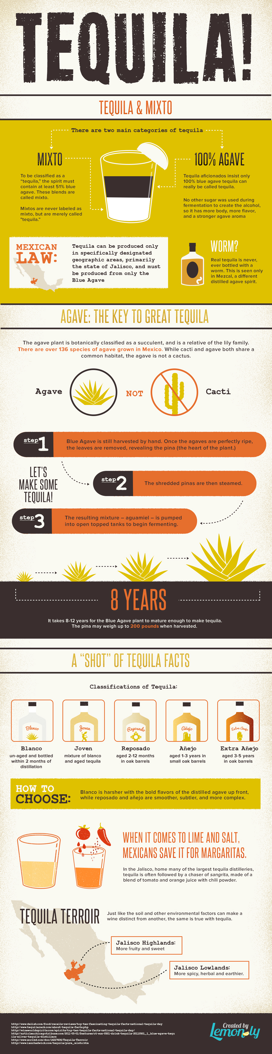 InfographicTequila: It's a love/hate relationship. In honor of Cinco De Mayo and just because, team Lemonly decided to make an infographic all about tequila. Did you know legit tequila is never, ever bottled with a worm? Did you know how long it takes a blue agave plant to mature to make tequila? You'll learn it all here and be the tequila know-it-all at your next Cinco De Mayo celebration. You're welcome.