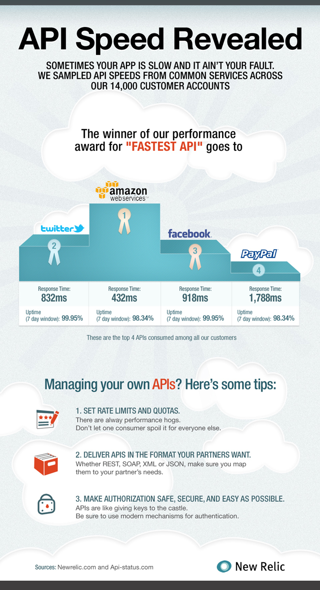 InfographicWe partnered again with New Relic to take a look at the top four API speeds used by their customers. And the winner for "Fastest API" goes to...Amazon web services, with a whopping 432 ms response time!