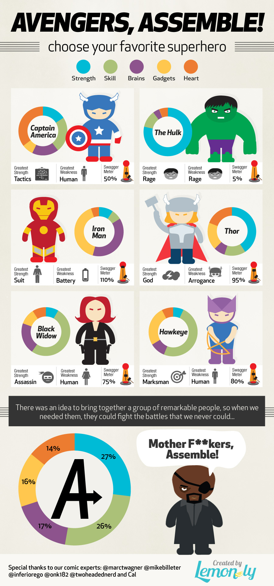 InfographicWe are never shy to embrace our inner (or often very outer) geek here at Lemonly. We have some Potterheads, Twihards, Trekkies, and I guess Avengaholics on the team and we love to have fun. In honor of the release of the "first big blockbuster of the summer," The Avengers, we asked Twitter to rank the six avengers across five different superhero categories. According to the comic book experts, here are the Avengers infographic results...