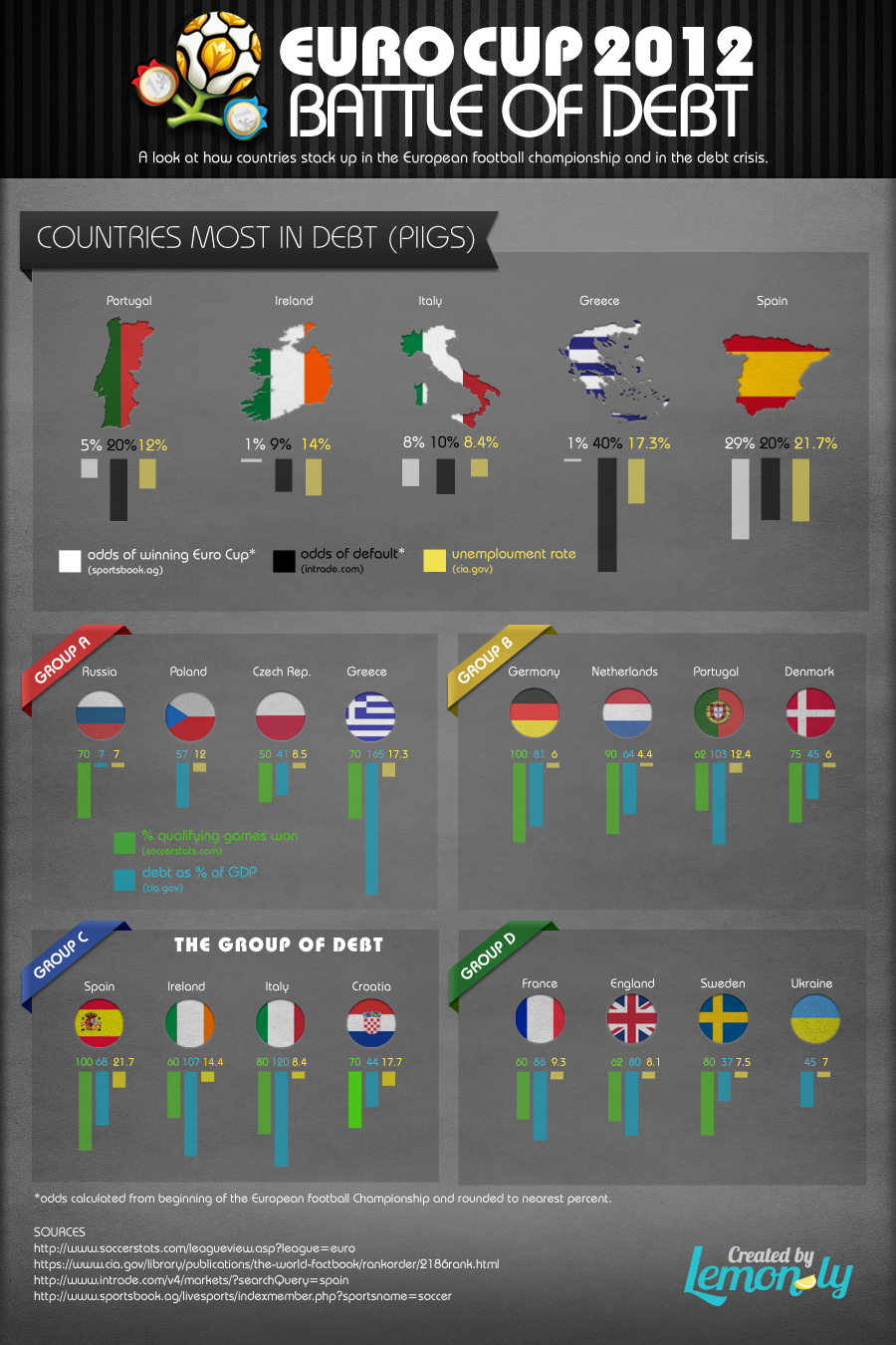 InfographicIt's Euro Cup 2012 time!! Here at Lemonly, we definitely have a few soccer/football fans pumped up for the tournament, where the winner gains automatic entry to the 2013 FIFA Confederations Cup. We wondered though, how does the debt and odds of winning stack up for the countries? The Euro Cup is moving to the quarterfinals, but the euro currency trudges on...Take a look!