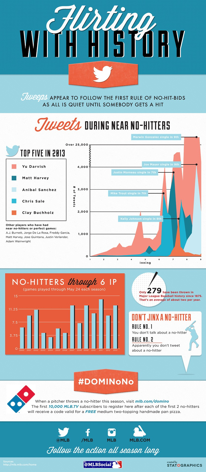 InfographicAnother great infographic for MLB Social, by Statographic, a division of Lemonly. The stats say it all, Twitter stays quiet during no-hit bids - until somebody breaks it up. Looks like the rule of not jinxing no-hitters applies to Twitter, too!