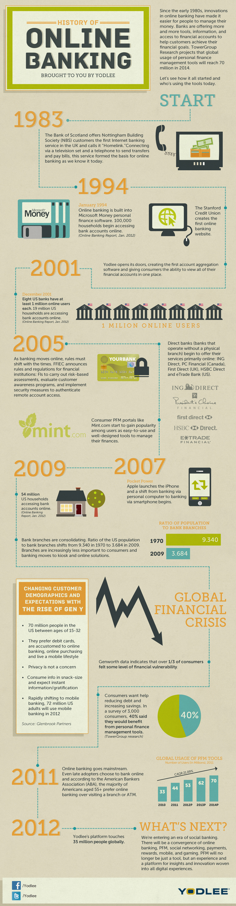 InfographicOnline banking. It's pretty awesome and downright handy! But do you know anything about its history? We sure didn't! We got to work with Yodlee on this fun timeline infographic about the interesting history of banking online. We definitely learned a thing or two in the process...Ca-Ching!