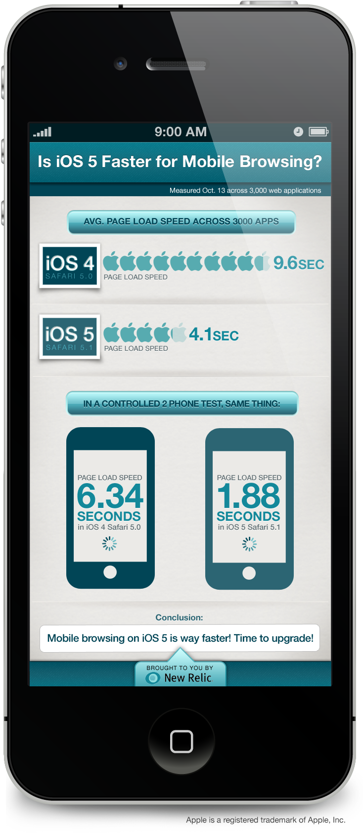 InfographicThe process of upgrading to iOS 5 from iOS 4 gave us plenty of time to ponder what we were getting into: Is instant camera going to change our world? Can we really Tweet directly from the core apps? is Safari performance actually better? Wait a second….performance improvements? Now you’re speaking New Relic's language. Lemonly teamed up with New Relic and looked at their Real User Monitoring data to see for sure. Well, the results of our snapshot study are in…and it looks something like this: