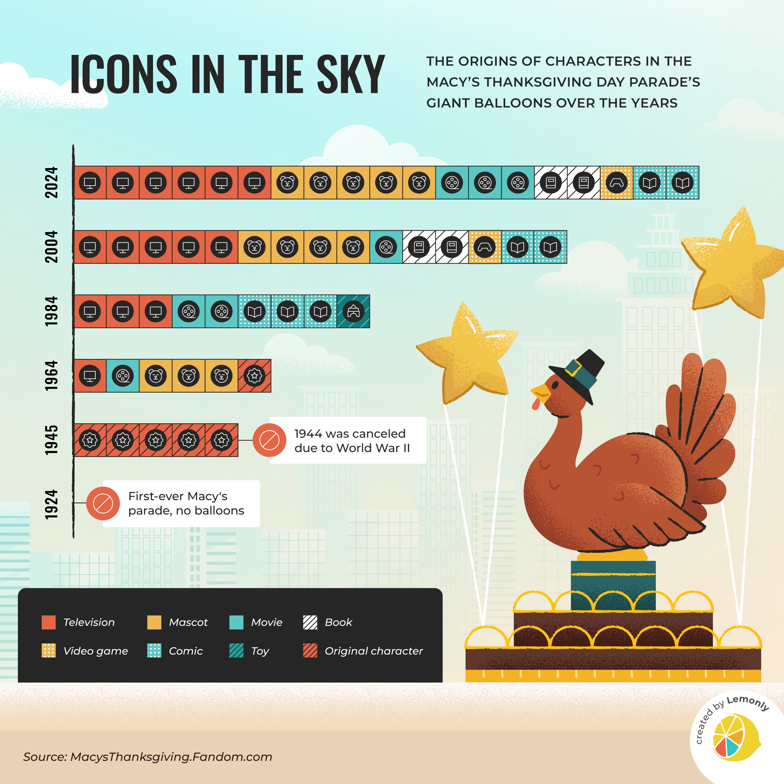 MicrocontentThe holiday season has us floating on air. March down memory lane with the iconic balloons of the Macy’s Thanksgiving Day Parade and see how these high-flying characters have multiplied over the decades.