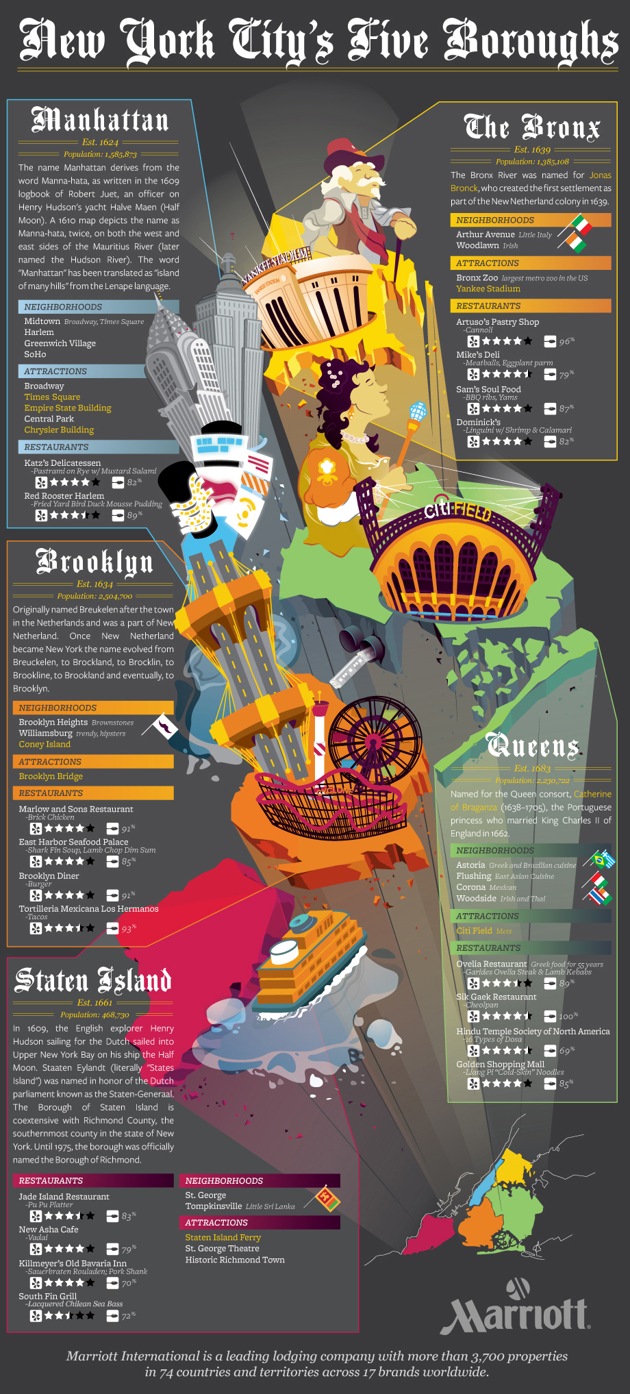 InfographicManhattan, The Bronx, Brooklyn, Queens, Staten Island - The five New York City boroughs. We teamed up with Marriott to create this handy infographic that gives a slice of history, attractions, neighborhoods, and best eats for each at a quick glance. It's a pretty great visual for the first time traveller and for the long-time Big Apple resident, alike!
