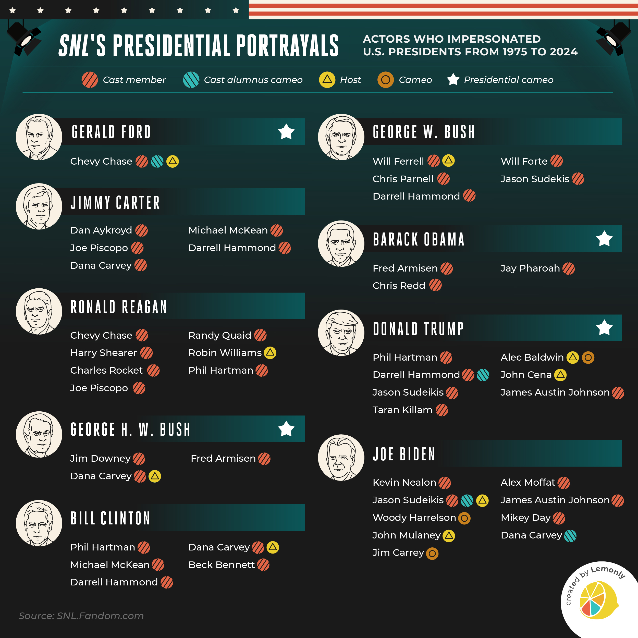 MicrocontentLive from New York, it’s presidential impressions! Since Saturday Night Live premiered in 1975, an impressive roster of cast, alumni, hosts, and comedians have spoofed the nation’s highest office. Here’s the full list of iconic impressions and colorful cameos.
