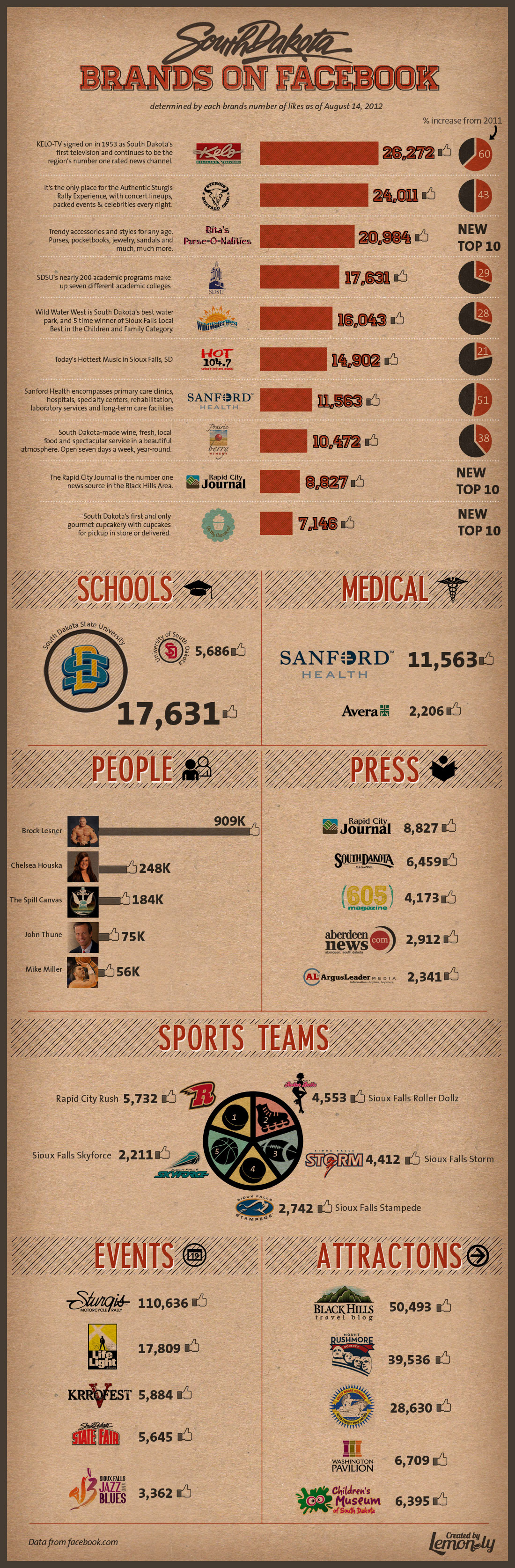 InfographicLast year, Lemonly made an infographic on which South Dakota brands (2011) were popular on Facebook. We thought we'd add some new categories and check up on the past brands to see which ones are still at the top of our list, which ones have made their first appearance and which ones have lost their hold on the heart of South Dakota. Do your favorites make the cut?