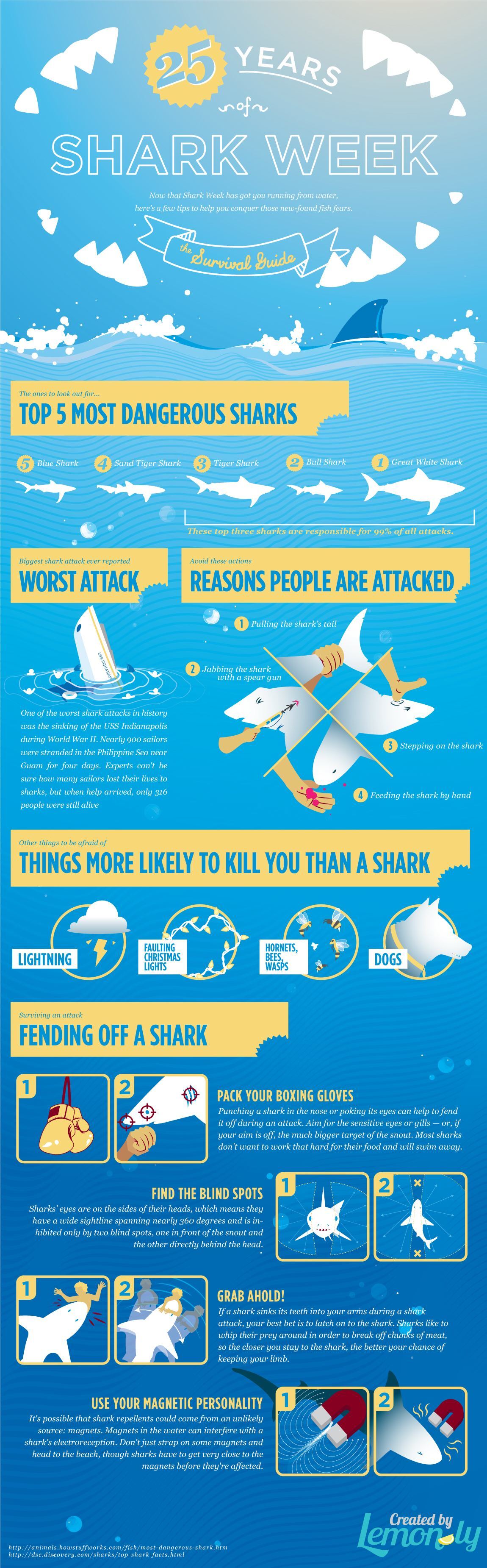 InfographicSince these shark tales may have heightened your fears of swimming and got you thinking twice about taking a dip (in both freshwater and saltwater) we’ve created a shark survival guide infographic providing you with shark defense - ensuring your best chances of surviving a shark attack. Also, be sure to take a look at our Shark Week 25th Anniversary infographic for a more fun!