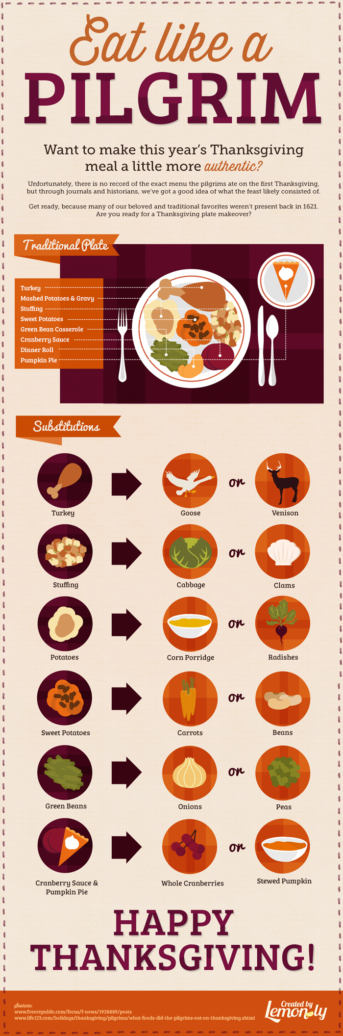 InfographicWant to make your Thanksgiving meal a little more authentic this year? Eat like a pilgrim with our handy guide to traditional Thanksgiving food infographic. Venison, corn porridge and stewed pumpkin for all!