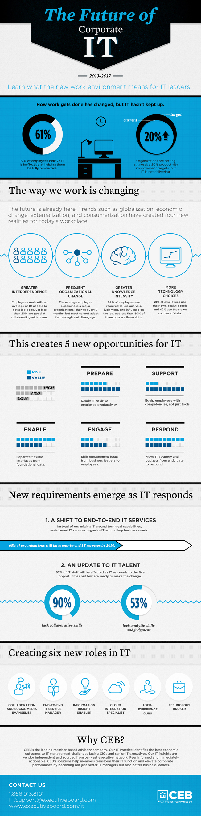 InfographicThe way we work is continually changing, which means the new work environment is changing for IT leaders, too. For this infographic, we got to work with CEB to visualize their survey results on the future of corporate IT. New requirements are emerging and new IT roles are spring up. Time to look into IT!