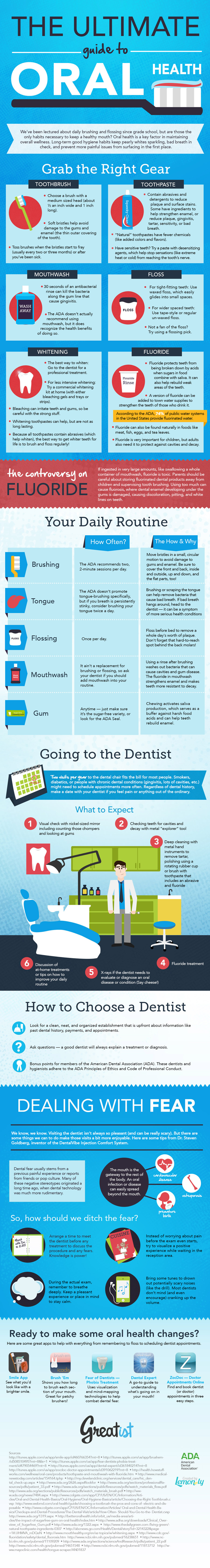 InfographicGood oral health definitely goes beyond brushing and flossing. Take a look at our latest Greatist graphic for the ins and outs of oral health. This is definitely the ultimate guide..sections like dealing with fear at the dentist to even picking the right one, plus a guide to the latest dental apps. Be prepared to be educated!