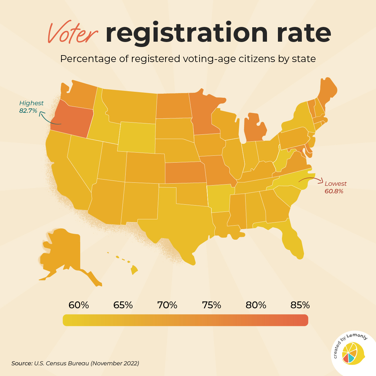 MicrocontentYour vote is your voice, and getting registered to vote is key to exercising your rights at the ballot box. Check out our state-by-state snapshot of voter registration rates across the U.S. — shown as a percentage of voting-age citizens in each state.