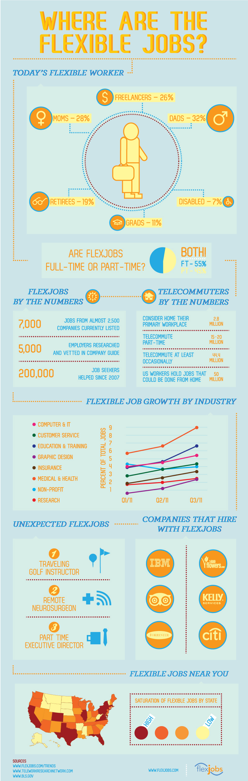 InfographicFlexJobs helps people find freelance, part-time, telecommute and flex-time jobs. I bet you never thought a neurosurgeon could work remotely. Think again!
